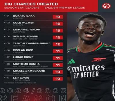 萨卡缺席近3场联赛,但本赛季创造19次重大机会仍领跑英超