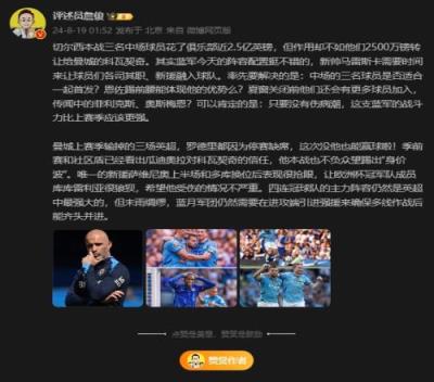 詹俊:切尔西本战三名中场球员花了俱乐部近2.5亿英镑,但作用却不如他们2500万镑转让给曼城的科瓦契奇。其实蓝军今天的阵容配置挺不错的,新帅马雷斯卡需要时间来让球员们各司其职、新援融入球队。率先要解决的是:中场的三名球员是否适合一起首发?恩佐踢前腰能体现他的优势么?夏窗关闭前他们还会有更多球员加入,传闻中的菲利克斯、奥斯梅恩?可以肯定的是:只要没有伤病潮,这支蓝军的战斗力比上赛季应该更强。