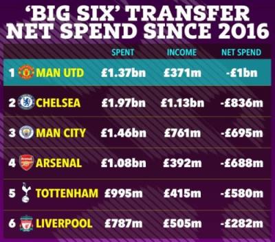 BIG6近9年支出:曼联净支出10亿镑!切尔西支出近20亿利物浦垫底