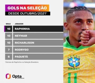 2021年10月上演巴西队首秀以来,拉菲尼亚(30场)已在巴西队的比赛中打进10球,与内马尔(15场)、理查利森(16场)并列队内同期最多。