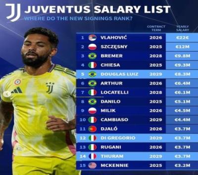 德转列尤文薪资榜:弗拉霍维奇2200万欧,什琴斯尼1200万欧次席