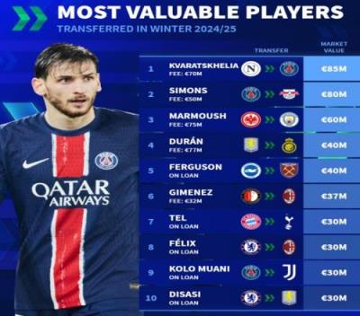 体育资讯2月8日报道宣称 《转会市场》统计了今年冬窗转会身价最贵球员情况,克瓦拉茨赫利亚居首。