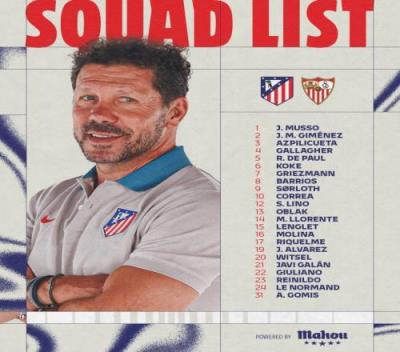 马竞对塞维利亚名单:格列兹曼、小蜘蛛、勒诺尔芒、莫利纳在列