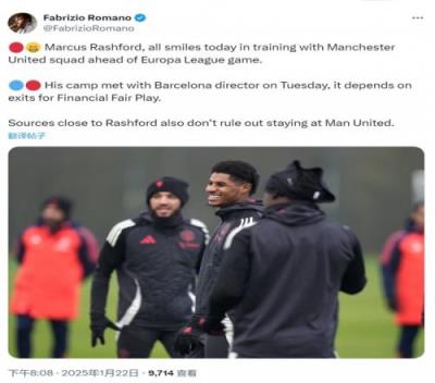 罗马诺指出,拉什福德今天参加曼联训练时笑容满面,他的团队本周二与巴萨总监会谈,但考虑到财政公平规则的限制,交易成行与否取决于巴萨球员的离队情况,接近拉什福德的人士表示,不排除球员留在曼联。