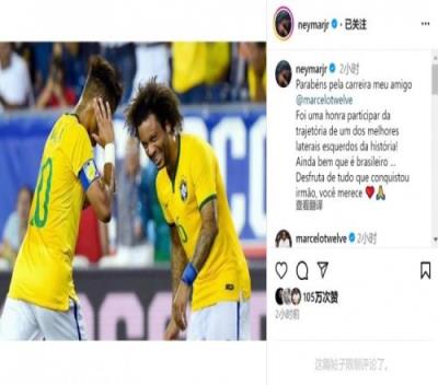 内马尔晒出与马塞洛在巴西队的合照,并写道:“祝贺你度过精彩的职业生涯,我的朋友马塞洛。”