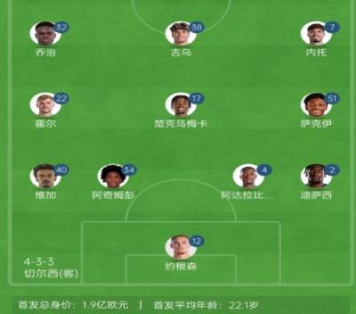 切尔西首发:12-约根森(22岁)、2-迪萨西(26岁)、4-阿达拉比奥尤(27岁)、34-阿奇姆彭(18岁)、40-维加(21岁)、22-霍尔(26岁)、51-拉克-萨基(19岁)、32-乔治(18岁)、17-楚克乌梅卡(21岁)、38-吉乌(18岁)、7-内托(24岁)
