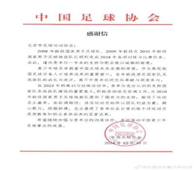 2008年龄段国家男子足球队、2009年龄段及2010年龄段国家男子足球选拔队已顺利完成2024年各项训练与比赛任务。在此,谨向上北京市足球运动协会、重庆足协、大连市足协、江苏足协、新疆足协等单位一年来的支持与配合致以诚挚的谢意。
