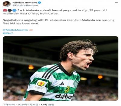 体育资讯7月11日报道宣称 据转会专家罗马诺透露,亚特兰大报价凯尔特人中场奥莱利。