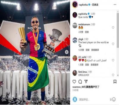 拉菲尼亚在社交媒体上晒出手拿冠军奖杯、最佳球员奖杯的照片,配文:“多么美妙的夜晚。”