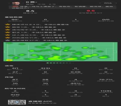 B费本场:1助攻,3次过人&11次对抗成功全场最多,8.4分全场最高