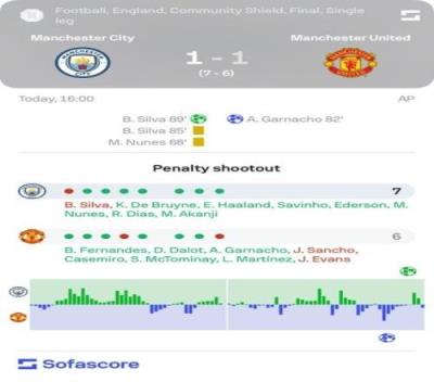 体育资讯8月11日报道宣 曼城在社区盾点球击败曼联,得以赢得新赛季首冠。全场关键数据如下: