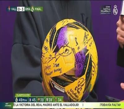 体育资讯1月26日报道宣称 今天凌晨,姆巴佩在皇马3-0击败巴拉多利德的比赛中上演帽子戏法,赛后他向皇马TV镜头展示了皮球,上面写满了队友的签名和祝福。