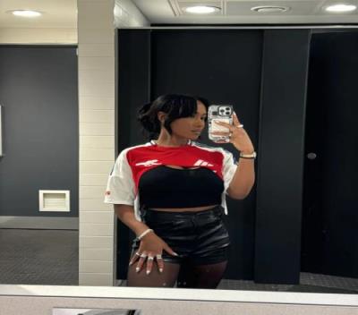 英超第14轮,阿森纳主场2-0击败曼联,萨卡女友托拉米-本森身穿高剪裁阿森纳球衣和热辣皮裤现场观战。