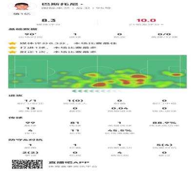 巴斯托尼本场1球+7对抗6成功0犯规+4造犯规获评8.3分全场最高