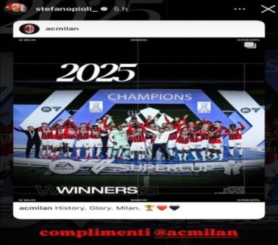 体育资讯1月8日报道宣称 在米兰夺得意超杯冠军后,前米兰主帅皮奥利也通过社交媒体祝贺了球队。