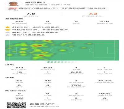 姆巴佩本场数据:3次射门2次射正,送出3记关键传球&获评7.8分