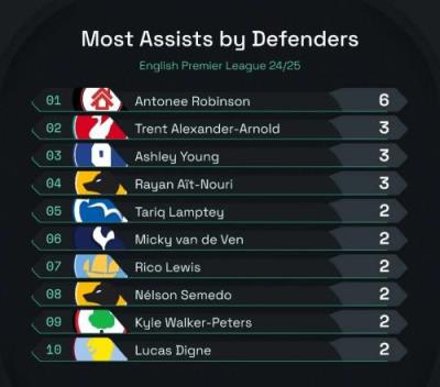 本赛季英超后卫助攻榜:罗宾逊6助居首,阿诺德、阿什利扬3助