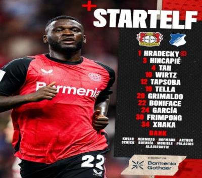 勒沃库森vs霍芬海姆首发:维尔茨、扎卡先发博尼法斯出战