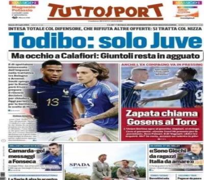当地时间本周六,《都灵体育报》在头版发布了托迪博和卡拉菲奥里的照片,并表示:“托迪博现在只想来尤文。但要小心卡拉菲奥里,(尤文体育总监)吉恩托利可能会突然出手。”