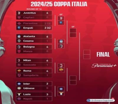 意大利杯8强对阵:尤文战恩波利、米兰对阵罗马、国米对阵拉齐奥