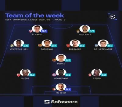 sofascore本轮欧冠最佳阵:小蜘蛛领衔,维尼修斯、拉菲尼亚在列