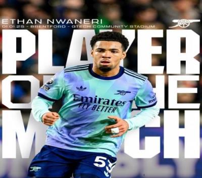 体育资讯1月2日报道宣称 英超第19轮比赛,17岁小将恩瓦内里首发出任边锋,帮助阿森纳客场3-1击败布伦特福德。