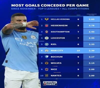 体育资讯12月17日报道宣称 据德国转会市场统计,曼城11月以来各赛事场均丢球2.3粒 ,五大联赛球队同期第6多。