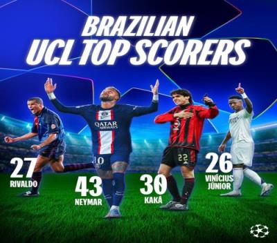 体育资讯12月12日报道宣称 在昨天结束的欧冠比赛中,皇马3-2击败亚特兰大,刚刚伤愈复出的维尼修斯传射建功。凭借这粒进球,他升至巴西球员欧冠射手榜第4位,内马尔仍然稳居榜首。
