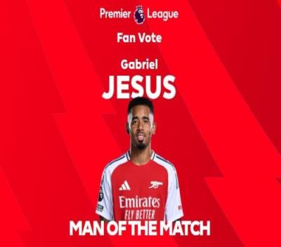 毫无悬念!官方:热苏斯被球迷投票为本场英超最佳球员