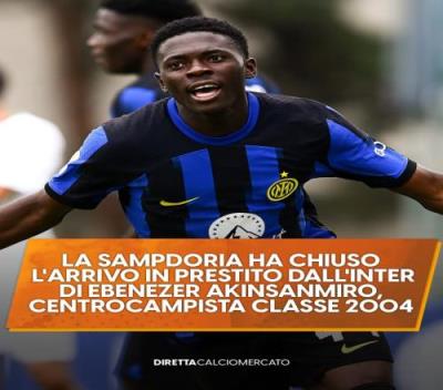 体育资讯7月9日报道宣称 据意大利转会专家迪马济奥的消息,国米小将阿金桑米罗(Ebenezer Akinsanmiro)即将租借离队,他将前往桑普多利亚踢球。