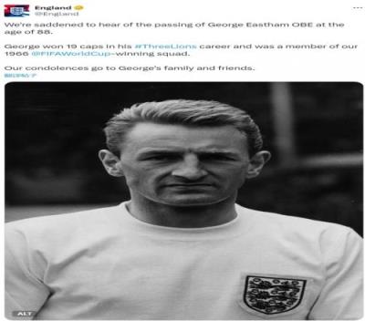英格兰队官方社媒发文致哀:“我们沉痛地获悉乔治-伊斯特姆逝世,享年88岁。 乔治三狮军团生涯出场19次,并且是我们1966年世界杯冠军成员之一。我们向乔治的家人和朋友表示哀悼。”