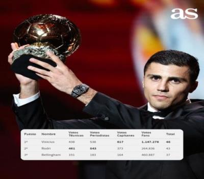 《法国足球》金球奖目前是国家队排名前100的记者进行投票,在今年的金球奖上,罗德里击败维尼修斯,最终获奖。