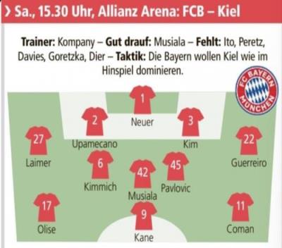 体育资讯2月1日报道宣称 拜仁将在本轮德甲对阵基尔,《慕尼黑日报》预测了拜仁首发情况,基米希预计回归中场。
