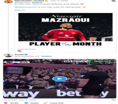 马兹拉维在曼联队内的11月最佳球员候选中击败了奥纳纳和迪亚洛,11月份,马兹拉维打满5场比赛并送出1次助攻,而迪亚洛则出场5次,贡献2球2助。