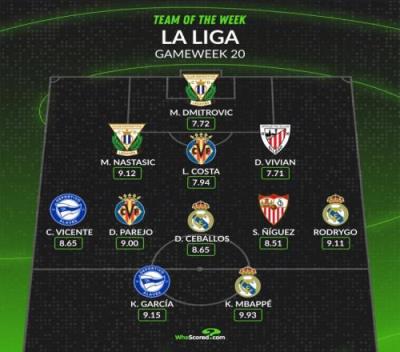 WhoScored西甲第20轮最佳阵容:姆巴佩、罗德里戈、塞巴略斯在列