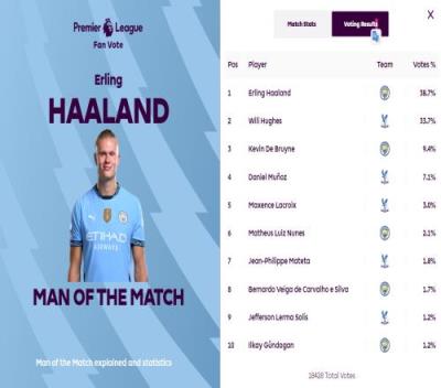 体育资讯12月8日报道宣称 本赛季英超第15轮,曼城客场2-2战平水晶宫。赛后,本场比赛为曼城破门的哈兰德以38.7%的得票率当选全场最佳球员。