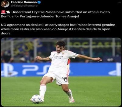 罗马诺:水晶宫正式报价本菲卡后卫托马斯阿劳霍