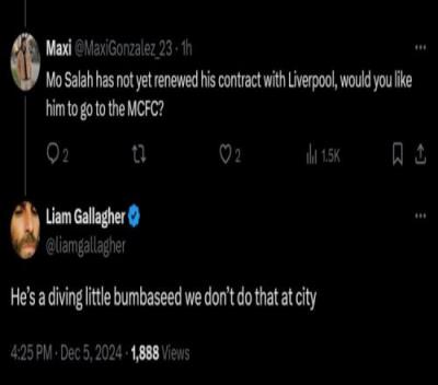 体育资讯12月5日报道宣称 本轮英超比赛中,曼城一扫阴霾,3-0击败森林,利物浦则是战平了纽卡。赛后,知名曼城球迷、绿洲乐队主唱利亚姆发推庆祝球队获胜。