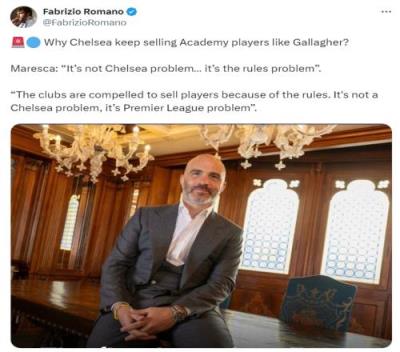 在被问到为何出售像加拉格尔这样的俱乐部青训人才时,切尔西新帅马雷斯卡的说法引发了球迷热议,马雷斯卡表示切尔西是“受规则所迫”。