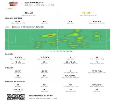 霍伊伦本场1射0正+1失良机+3造犯规10对抗4成功获评6.2分