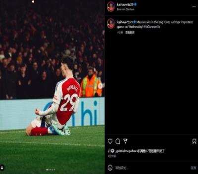 体育资讯2月3日报道宣称 本轮英超焦点战,阿森纳主场5-1击败曼城。赛后,哈弗茨更新社媒,庆祝这场大胜。