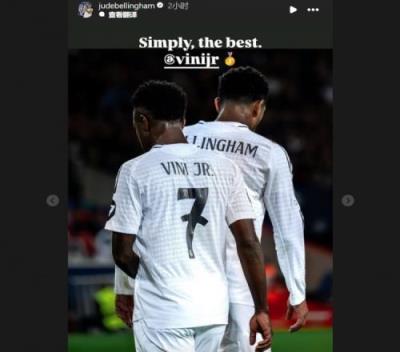 贝林厄姆也通过社媒转发了自己入选最佳阵和英格兰队官方送上的祝贺,他也晒出了自己和维尼修斯的合照,并祝贺对方:“你就是最佳!”
