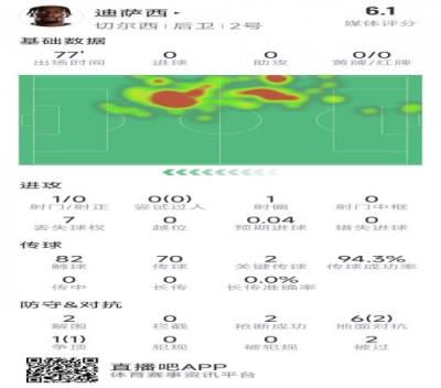 迪萨西本场数据:2次关键传球,2次解围,2次抢断,评分6.1分