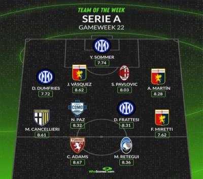 WhoScored意甲第22轮最佳阵容