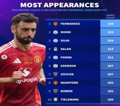 体育资讯8月15日报道宣 曼联已经官宣和B费续约,《转会市场》统计显示后者也在近年英超球员中出勤数最高。