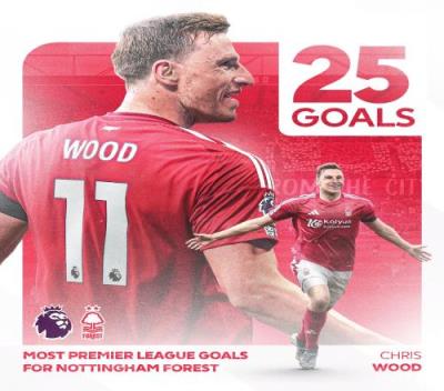 伍德打进森林生涯第25粒英超进球,成为队史英超射手王