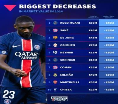 德转列2024年身价跌幅最大榜:穆阿尼4000万欧居首,萨内次席
