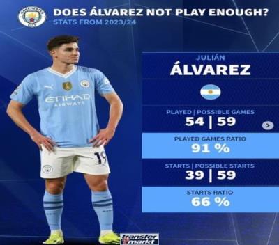 而《转会市场》数据统计显示,阿尔瓦雷斯在上赛季可以为曼城出战的59场比赛中上场54次,出场率高达91%。其中首发39次,首发率也达到了66%,在队内攻击手中位列第4。