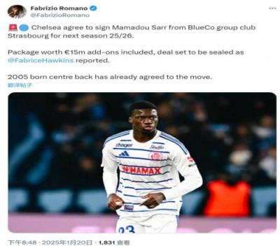 体育资讯1月20日报道宣称 据知名记者罗马诺透露,切尔西引进斯特拉斯堡中卫马马杜-萨尔达成协议,球员下赛季加盟。