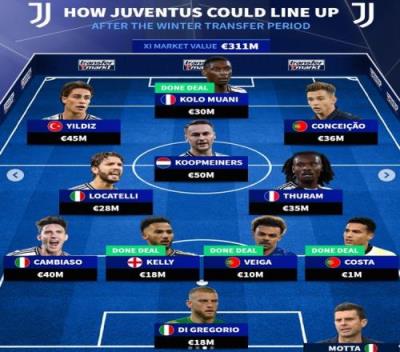体育资讯2月7日报道宣称 五大联赛冬窗已经结束,《转会市场》也根据补强预测了尤文在冬窗补强后的阵容,多位租借加盟的新援在列。